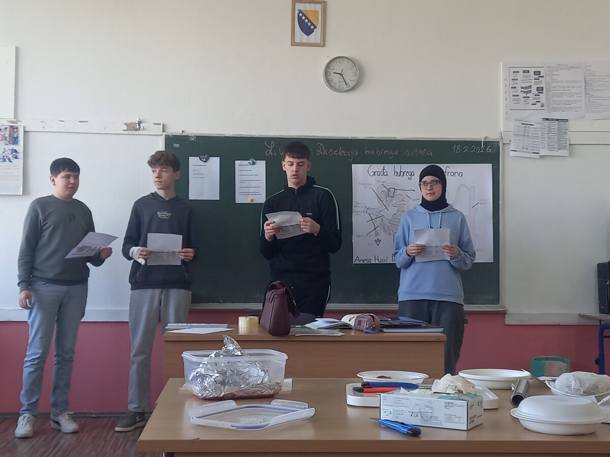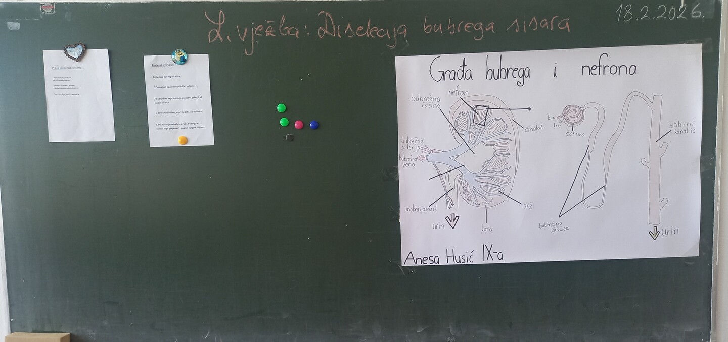 18.2.2026.godine u IXa razredu nastavnica Lejla Vikalo održala je ogledno-ugledni čas iz Biologije. Laboratorijska vježba je realizirana na temu "Disekcija bubrega sisara". Učenici su imali priliku da kroz praktičan rad nauče osnovne funkcije bubrega i njihovu funkciju.